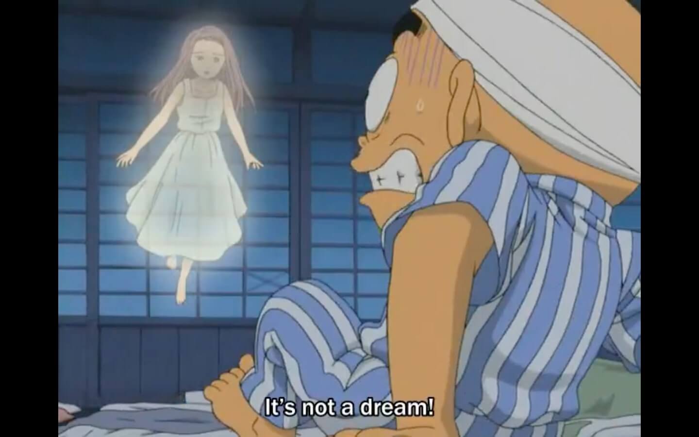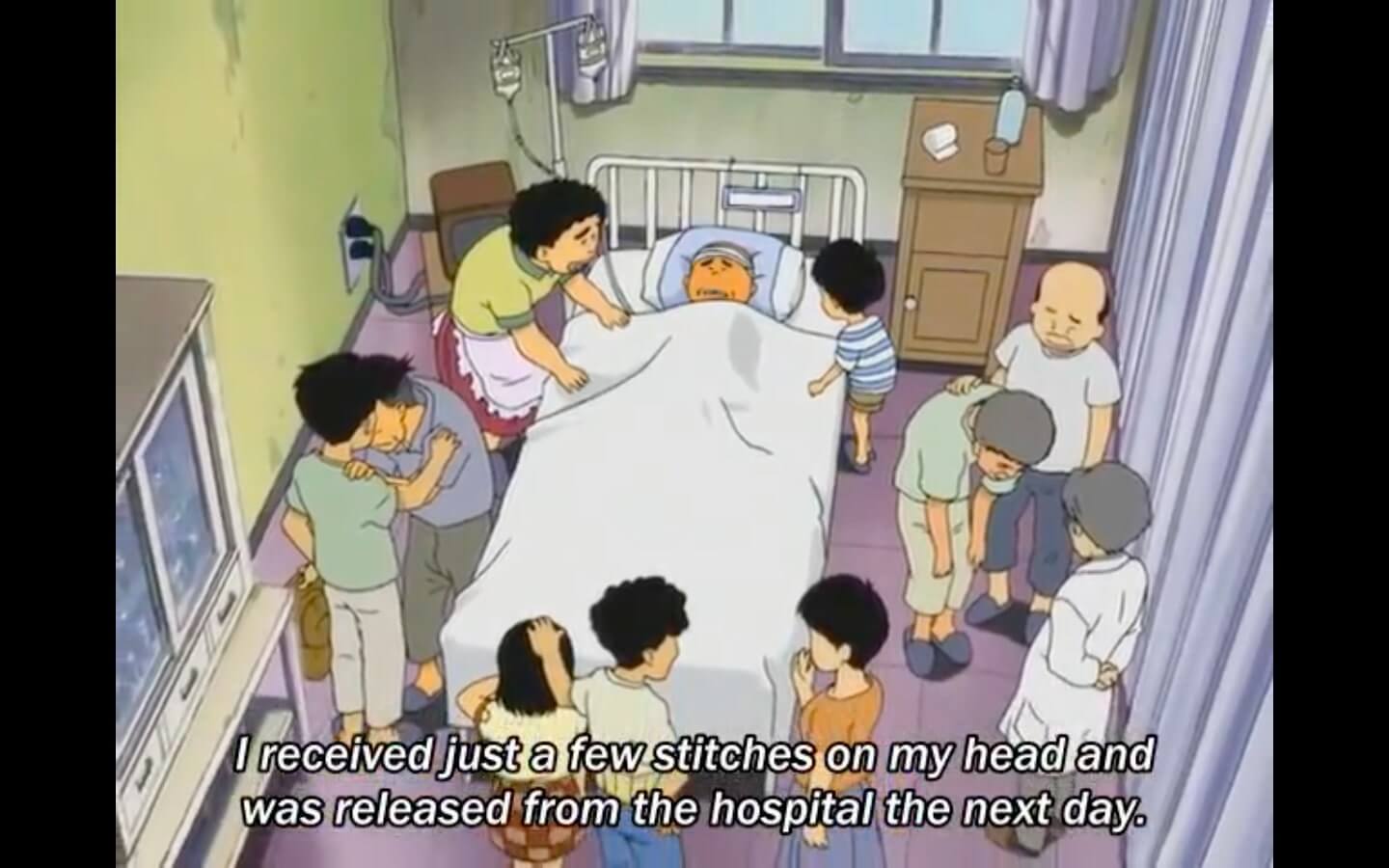the second half of the episode is just More Of Ichiro's Bullshit But He's BALD now because he had to get 9 stitches in his head. he breaks the sentimental black and white TV with a baseball bat that his grandpa had to save up money for when his other son DIED in WAR, he lights firecrackers inside the house and throws them at his MOTHER while she's COOKING, he gets haunted by the brown haired lady in the outhouse- Huh?