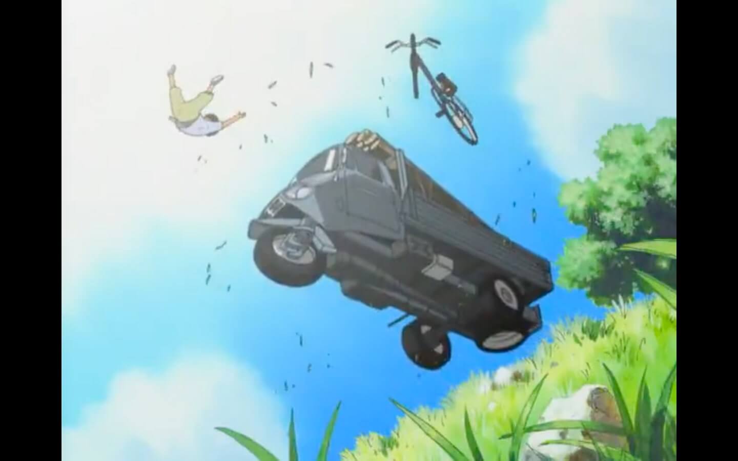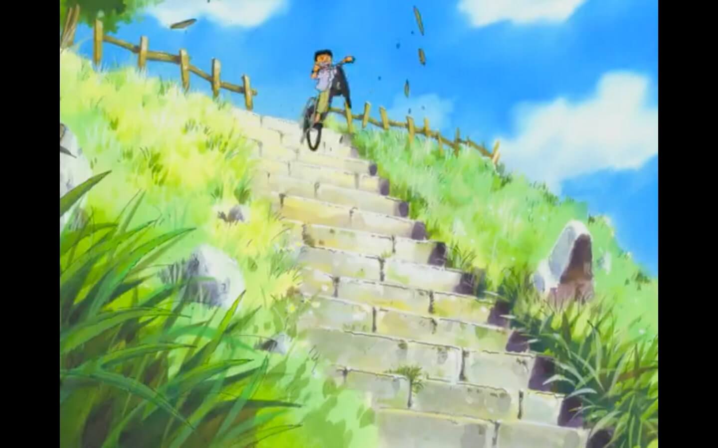 the episode opens with ichiro stealing a bike while he's running away from his mom (while calling her a Demon Hag!) and then riding the bike down the stairs and getting Hit By A Fucking Lumber Truck. there is then a long sequence of ichiro slowly falling down the hill while he narrates over it.