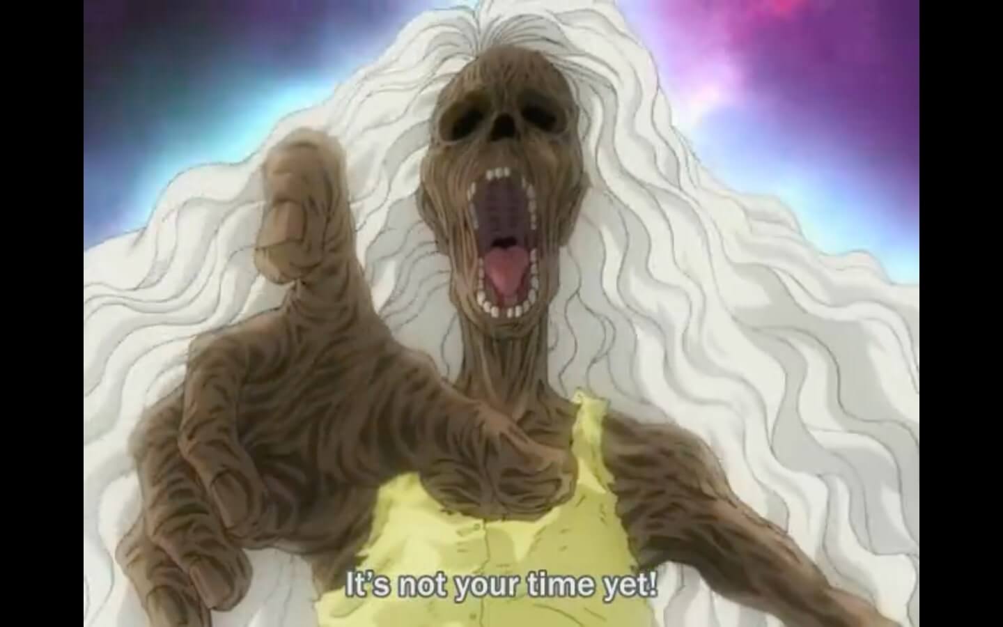 when we get back up to when the accident happens, the anime for one brief and blissful moment takes a more serious turn. everybody is worried for ichiro and we see a bunch of people crowding around his body... and then we see Ichiro's Ghost looking over all of them.