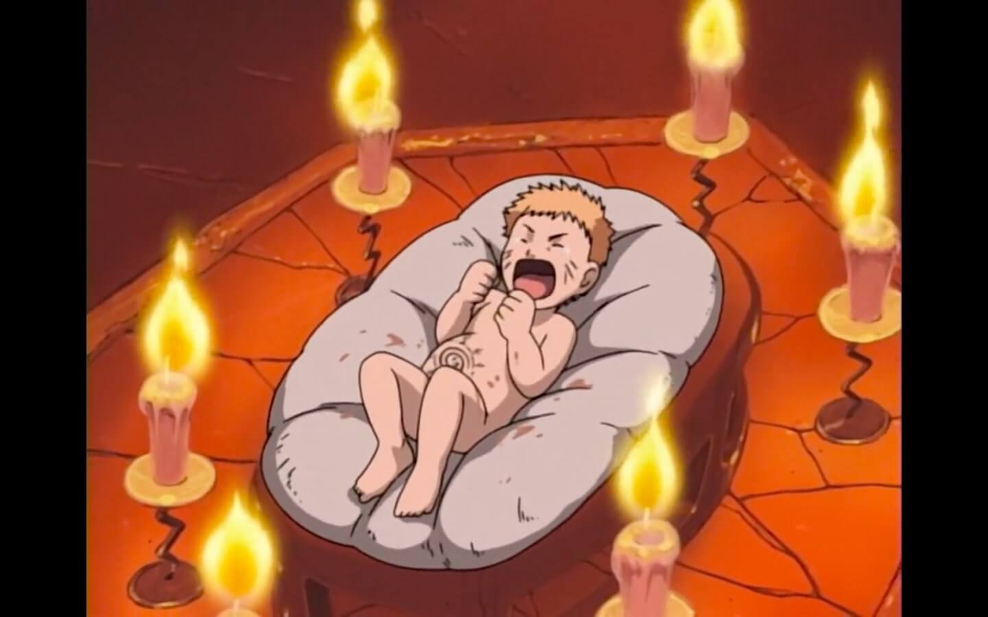 it's only defeated by a second giant fucking monster being led by the fourth hokage. during this fight, Baby Naruto is born! and a little swirly appears on his tummy.