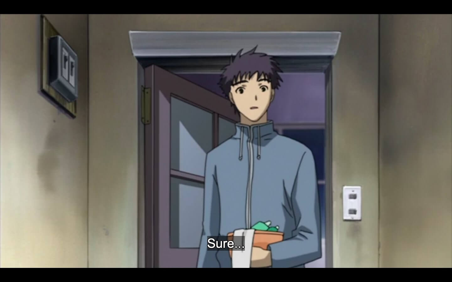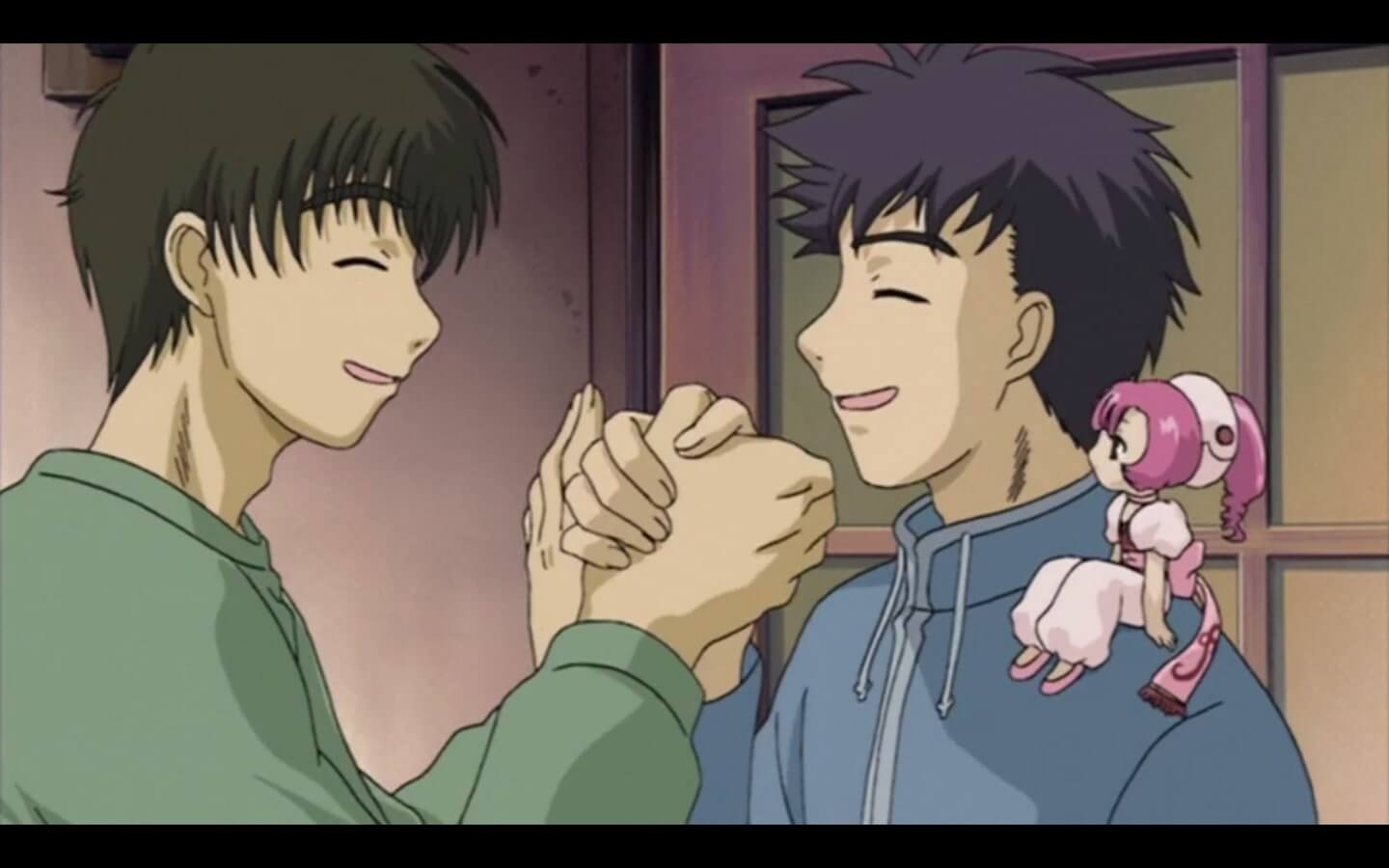 hideki moves into his new apartment, and gets a knock on the door. he opens it and is SHOT IN THE FUCKING FACE WITH A PARTY POPPER and a STRANGE LITTLE THING dancing on his face. this is his neighbor, shinbo! he's the same age as hideki, and is ALSO going to the same prep school as him! it's a fast friendship. yayyyy