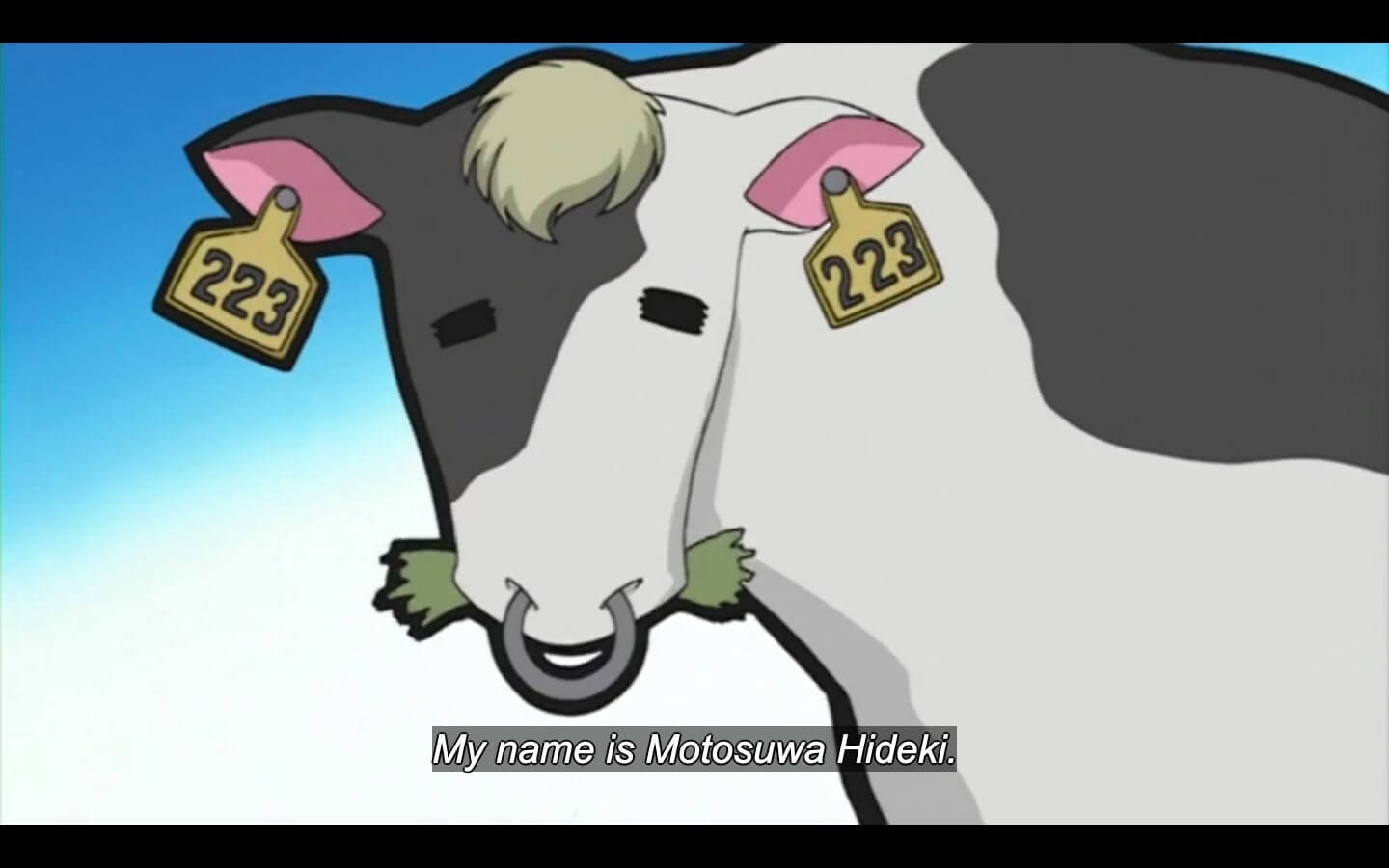 this is like the very first shot. they animate the cow eating like its talking. for a second i genuinely thought this cow was hideki