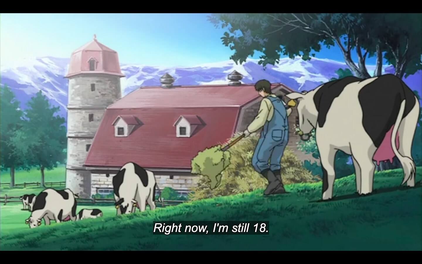 we open on a shot of our main character, hideki motosuwa. he's a farmboy!