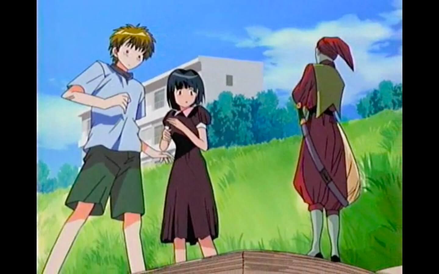 let's head right on back to SIX years ago. megumi and miki are presently 15, so they'd be 9 years old in this flashback. in this flashback, megumi is a boy, and miki is still miki. they're walking around when they suddenly spot an old guy wearing a cloak and hobbling with a cane.