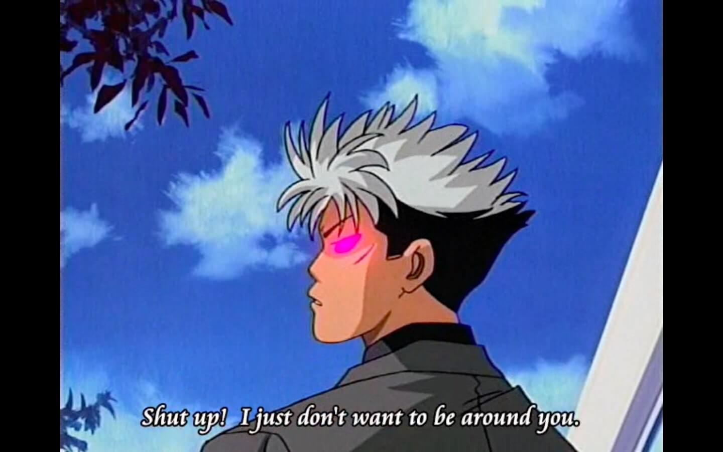 hideki goes out for a quick convenience store run, and we get to see him complaining even more about how ohhhh he WISHES he had a persocom but they're just so EXPENSIVE!!! if only he could just run into a really cute and pretty one laying around on the side of the street. SIIIIIGH. Yeah right, like THAT'D ever happen! this is the point to where i kind of stopped liking hideki as much.