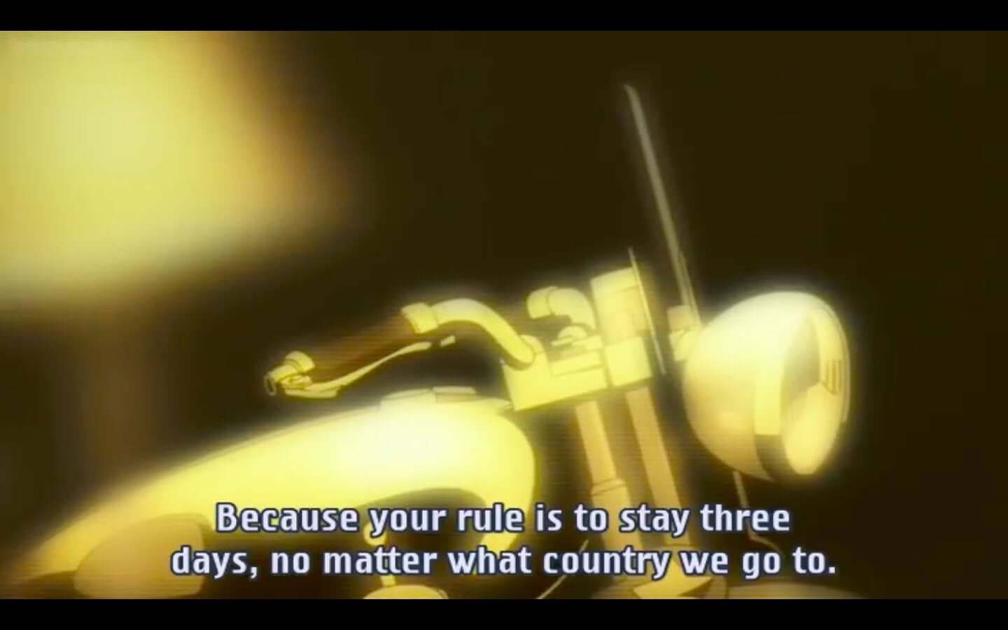 kino is a traveler. they want to explore and visit various countries around the world, staying in a country for at least three days. no more, no less. kino doesn't have any human companions, but they do have a soft-spoken motorcycle, named hermes.