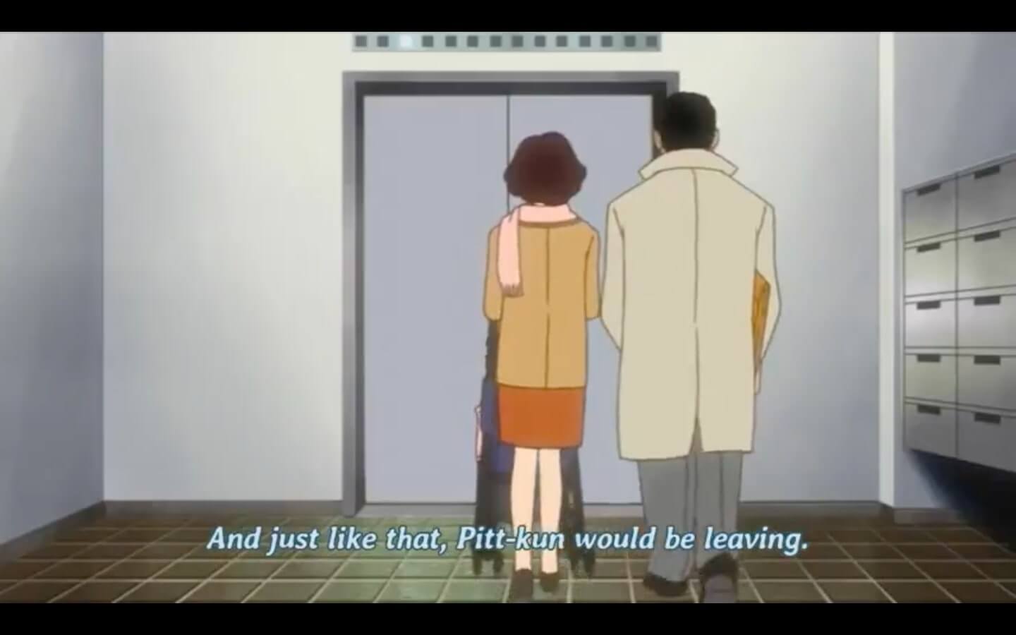 her husband meets her outside and informs her that pitt's owner will be sending someone to pick him up in the morning. her constant stress of hiding a penguin is over... she is free! she doesn't have to be scared of being evicted by kakei!