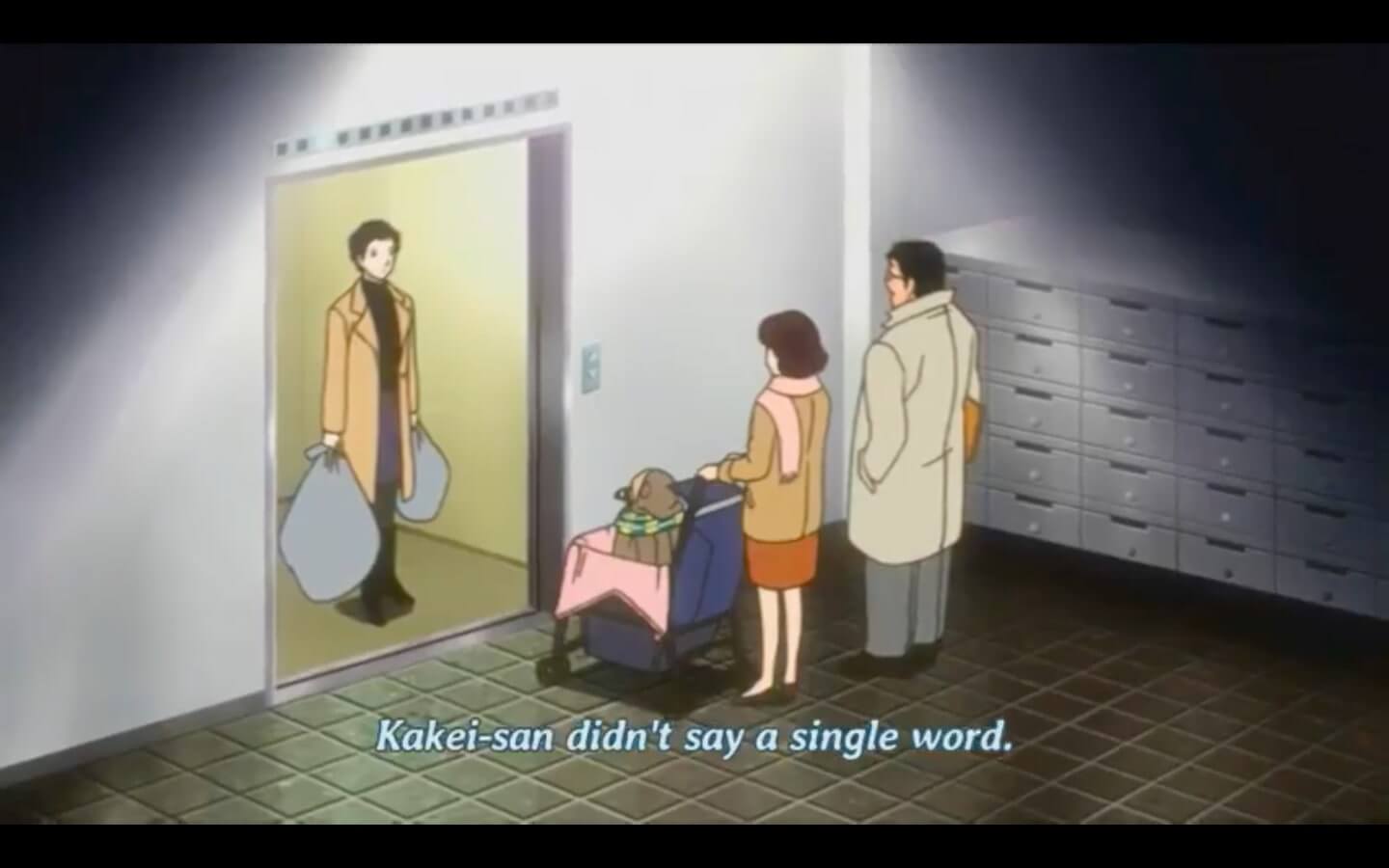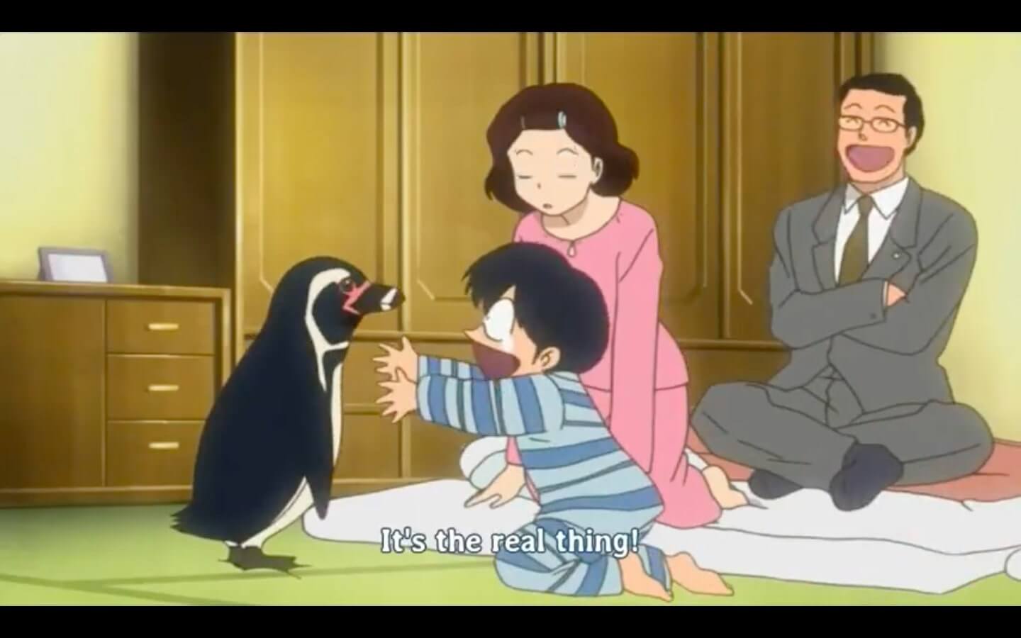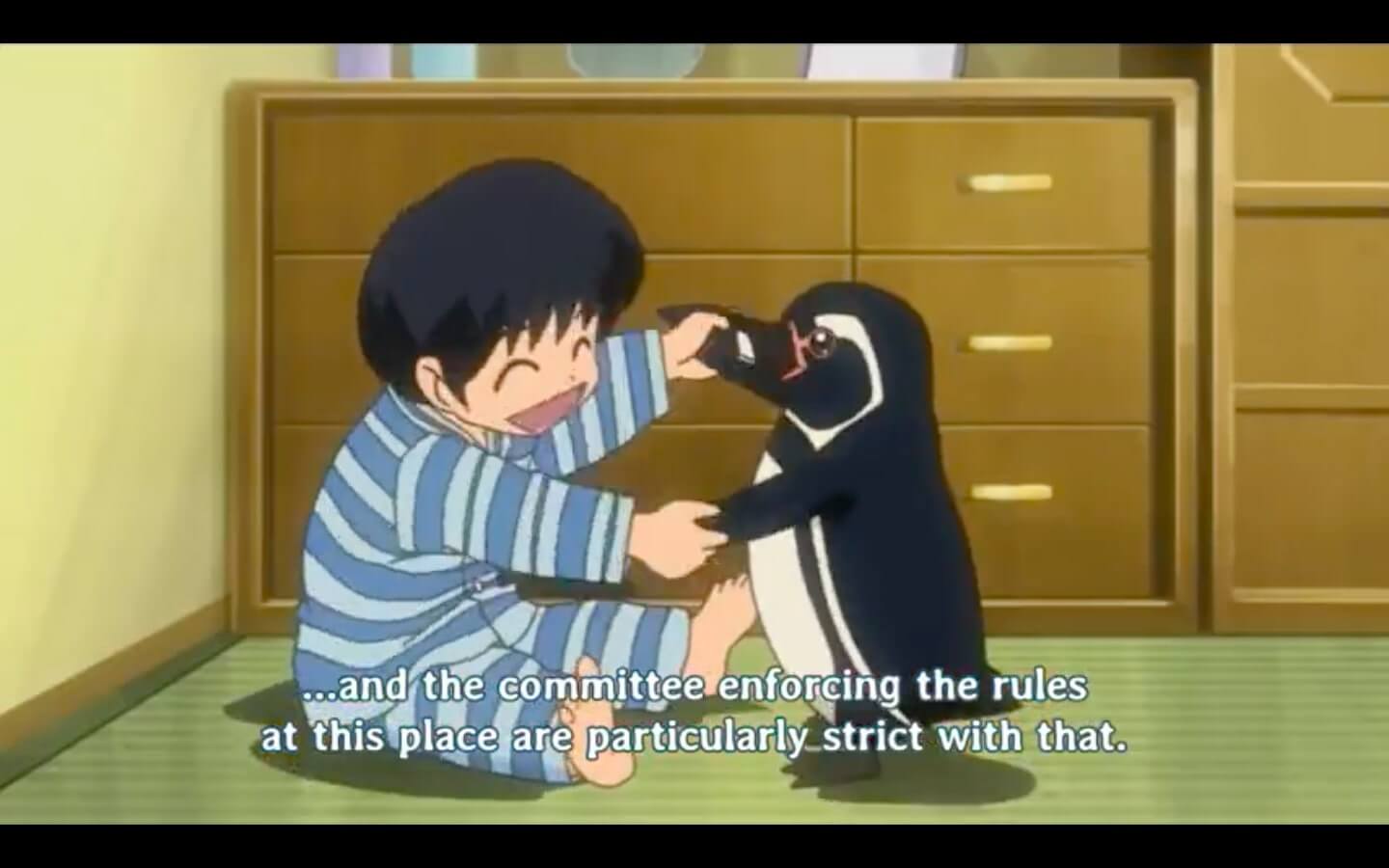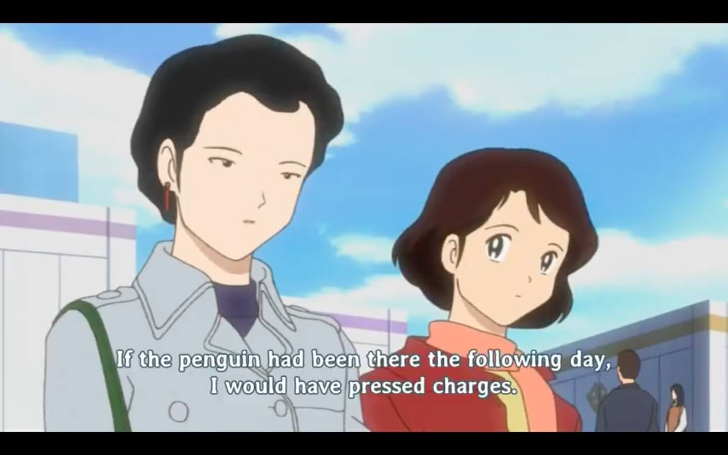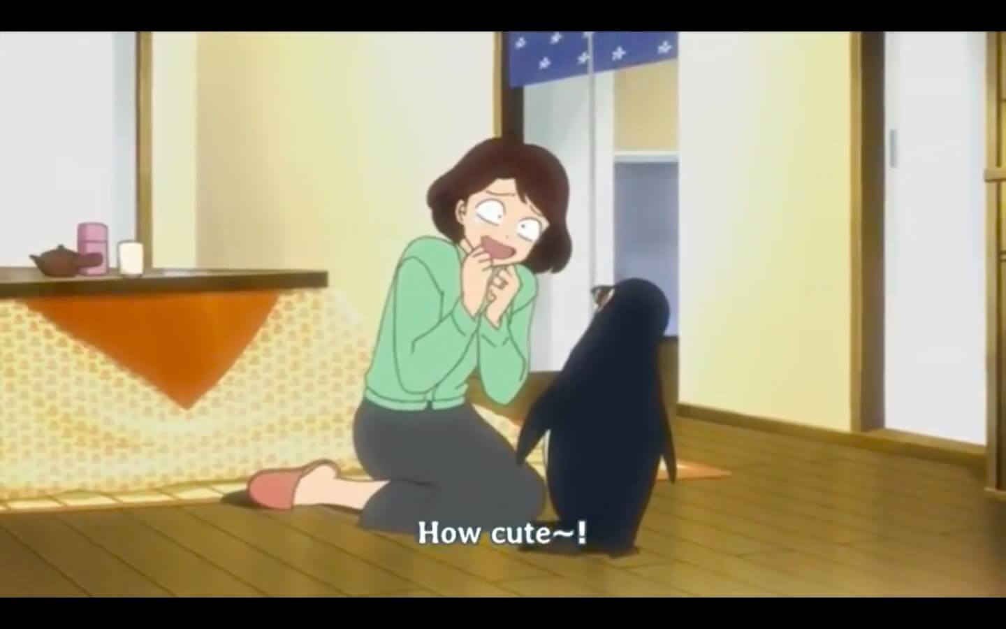 the rest of this episode is increasingly insane shenanigans happening surrounding haga DESPERATELY trying to keep this penguin a secret so she doesnt get FUCKING EVICTED. at one point she hides KAKEI'S SON into a CLOSET while she tries to convince kakei that Huhhh? No your kid isn't here at all! Nooo... Be on your way now! because haga's IDIOT SON INVITED HIM AND ALL OF HIS CLASSMATES OVER TO HANG OUT WITH THE PENGUIN!!!!!!!!!