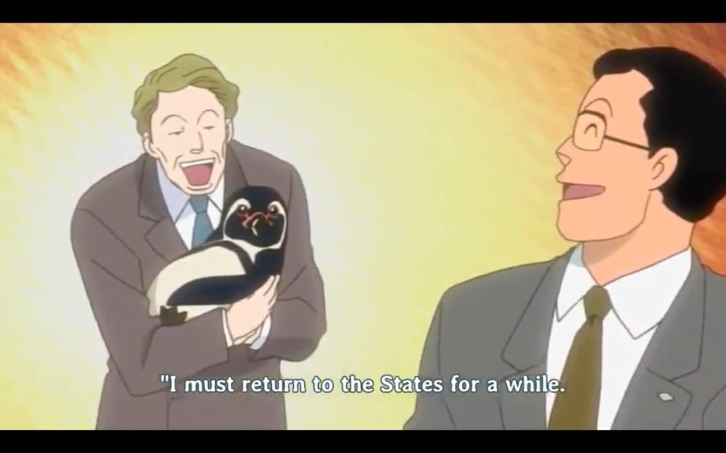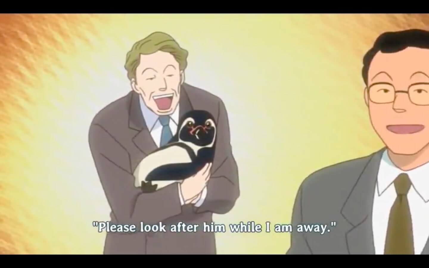 Haga-san's idiot husband brings home a penguin that they have to babysit for a week while the penguin's American Owner goes out on a business trip.
